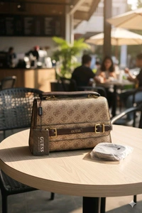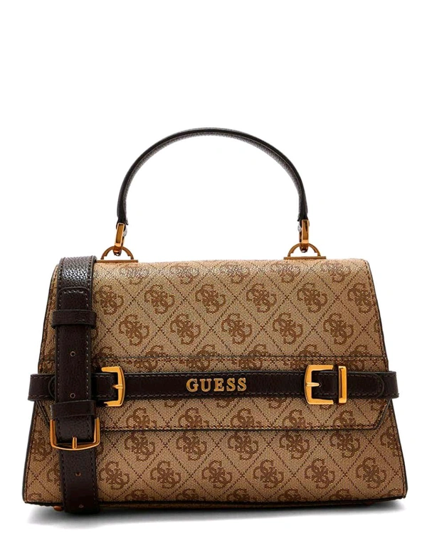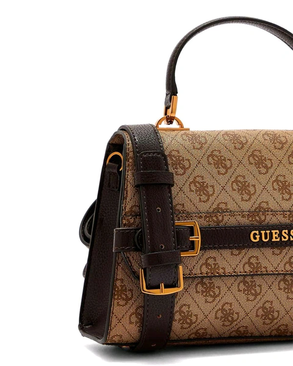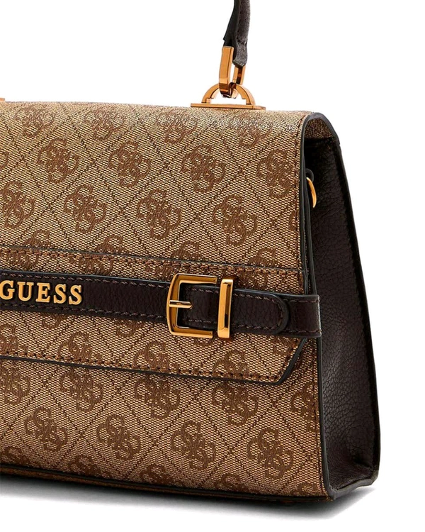 Crafted with meticulous attention to detail, this bag showcases the iconic Guess logo pattern in a rich brown hue that exudes luxury. Its structured silhouette and top handle design add a touch of refinement to any outfit, while the flap closure ensures your essentials are secure yet easily accessible.